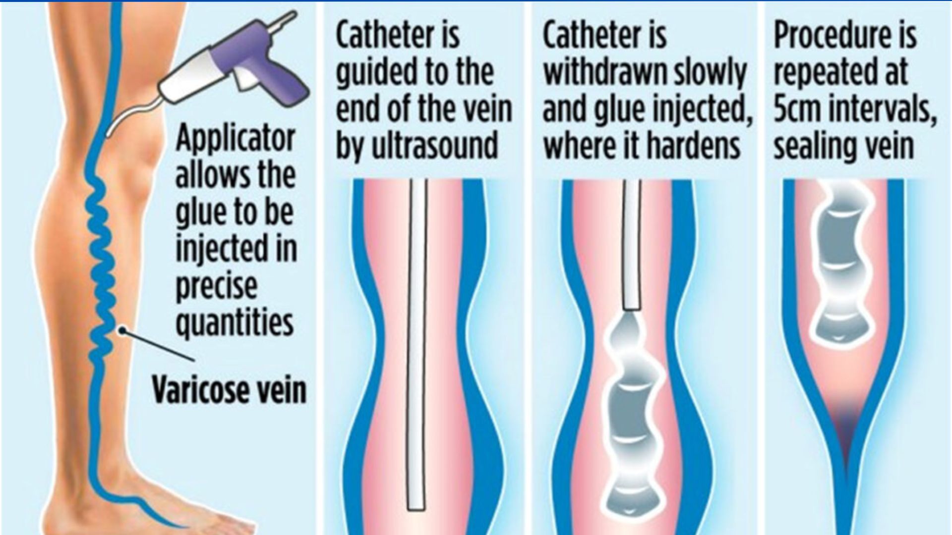 Since varicose veins may not always be visible on the surface, ultrasound is used to map and guide the procedure. Your doctor will insert a catheter to apply the medical glue.
